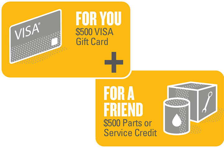 Reap rewards when you refer a friend to buy a new Cat® Machine. Submit your referral using the form below and earn a $500 Visa® Gift Card for you and a $500 Parts or Service Credit for your friend.