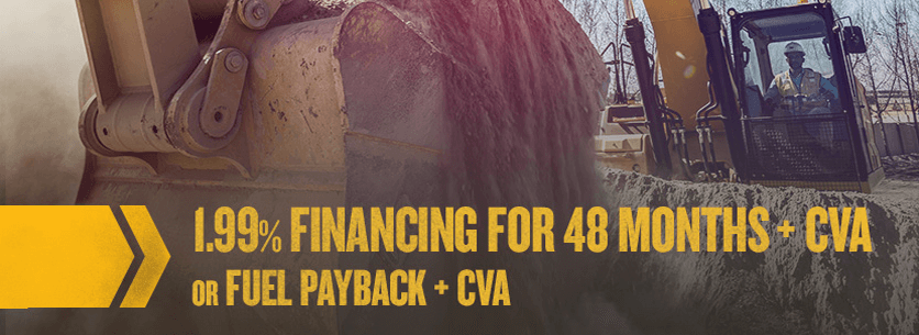 1.99% for 48 months: Offer valid July 1, 2021 through Dec 31, 2021. Offer eligible on selected new Excavators, Wheel loaders, Motor Graders, Track Type Tractors, Articulated Trucks and Soil Compactors Cat machines. Financing and published rate are subject to credit approval through Cat Financial Services Limited. Customers may also be eligible to participate in the Great Payback Event (as defined below).