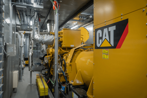 The system at EIA is made up of three Cat® G3512H natural gas, high efficiency gensets. These engines generate 1.4MW at 4160V each. There are two transformers and two electricity transmission feeds for four sources of power generation, and switchgear to choose the power source. There are also three enclosures for the gensets that are locally designed and manufactured in Canada to withstand our harsh climate. Everything is custom tailored for our customer’s specific application, including the CHP heat recovery and emission reduction equipment, custom controls and switchgear, and site-specific sound attenuation.