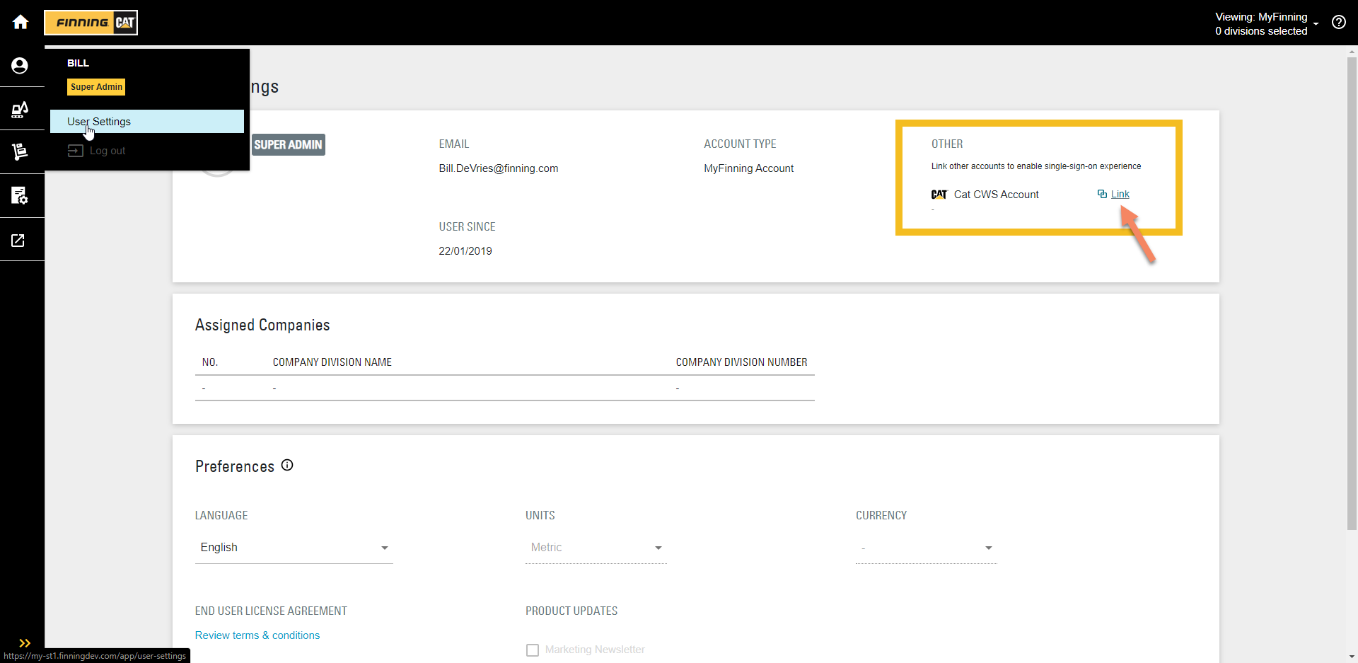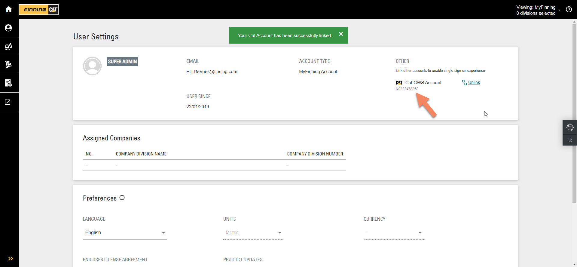 To enable SSO, you must have an active CUBIQ account (request one here) and manually link it to your Cat CWS account in the CUBIQ User Settings. The linking procedure is outlined below.