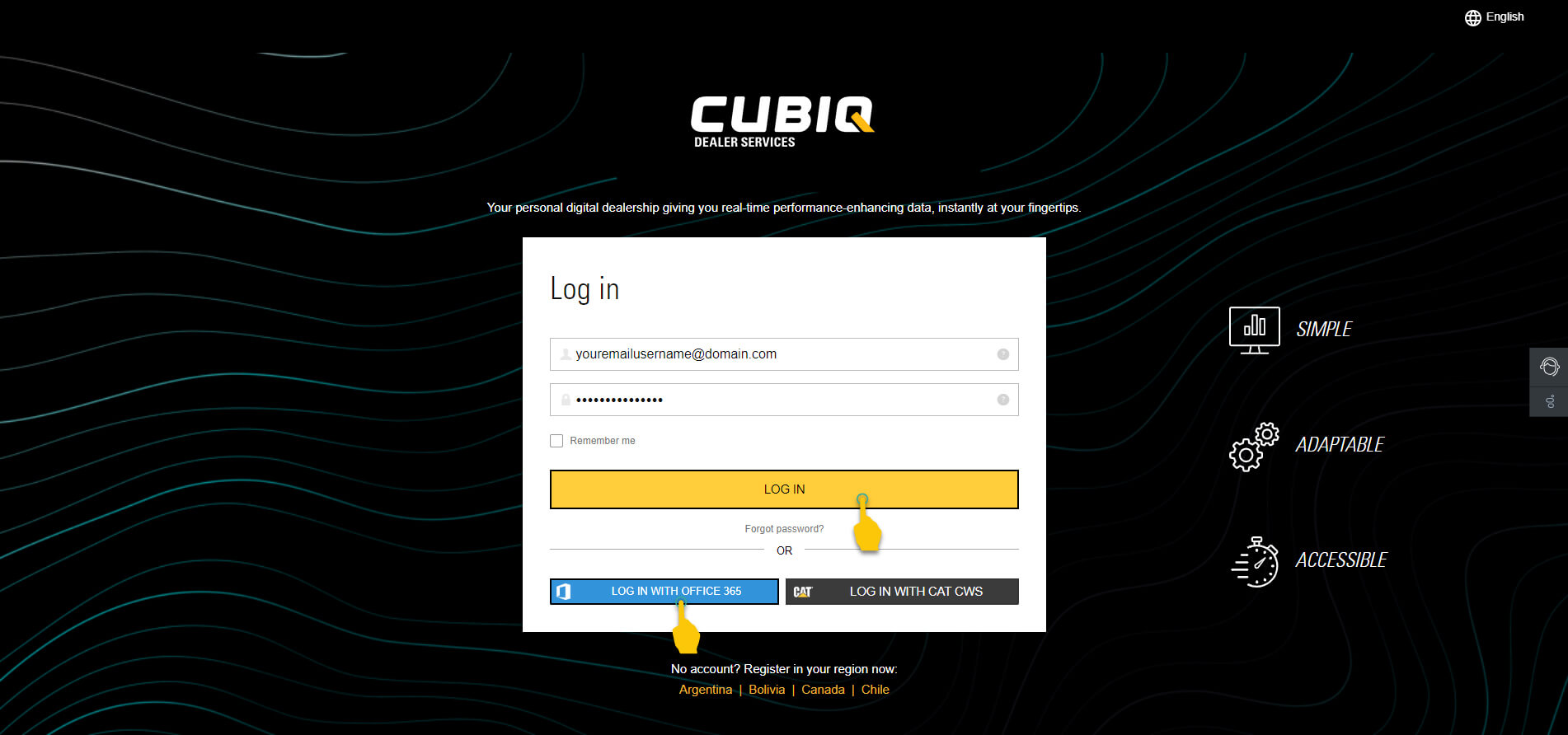 Now that your CWS ID is linked to your CUBIQ account, the next time you log in to the CUBIQ platform, simply click the "Log in with Cat CWS" button to login and put Finning at your fingertips.