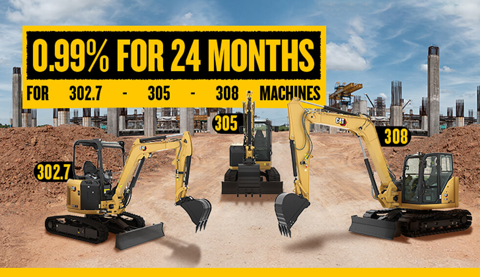 Looking for flexible finance? Take advantage of 0.99% for 24 months on all Cat® 302.7, 305 and 308 models from Finning