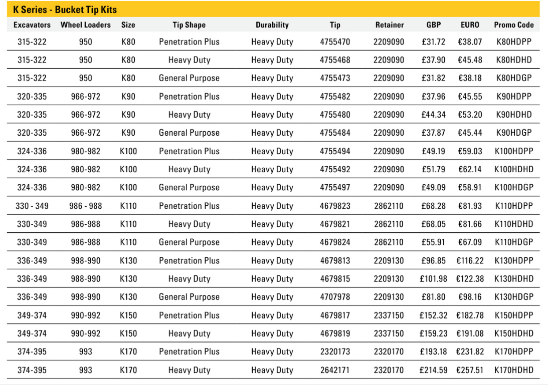 Alternatively, visit your local branch or call Parts Direct and quote promo code for required bucket tip kit.
