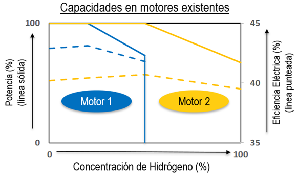 En el caso de los generadores a gas natural CAT, Mocilnikar anunció que se están desarrollando soluciones para incrementar hasta un 25% la capacidad de utilizar hidrógeno en equipos de generación eléctrica nuevos y existentes mediante kits de conversión. “En función al porcentaje de hidrógeno que se utilice, estos cambios traerán asociados posibles reducciones de potencia y eficiencia como se observa en el siguiente cuadro, debidos a que el hidrógeno no tendrá el mismo comportamiento del gas para el cual fue diseñado el motor en un principio. Al mismo tiempo, se requieren modificaciones en ciertos materiales y mayores medidas de seguridad por las características físicas y químicas particulares del hidrógeno”, expone.