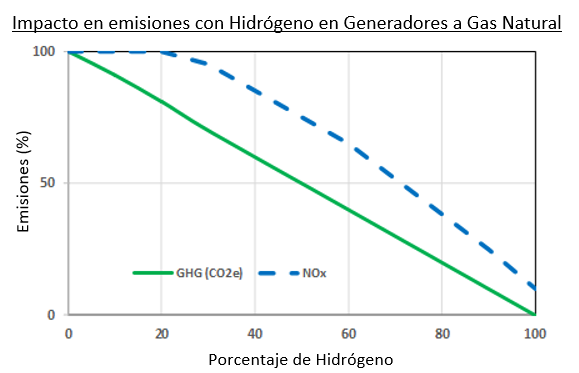 “Como se observa en el gráfico de emisiones en generadores a gas natural, cuanto mayor sea el porcentaje de hidrógeno en la mezcla, las emisiones de gases de efecto invernadero se reducirán en consecuencia. Al alcanzar un 100% de hidrógeno, las emisiones de CO2 se reducen a cero ya que no habrá carbono involucrado en la combustión. Distinto es lo que ocurre con los óxidos nitrosos (NOx), los cuales se generan por el nitrógeno del aire y las altas temperaturas de combustión. Por consiguiente, los motores que operan con 100% de hidrógeno no se consideran de “emisiones cero”, pero dichas emisiones se reducen significativamente”, explica.
