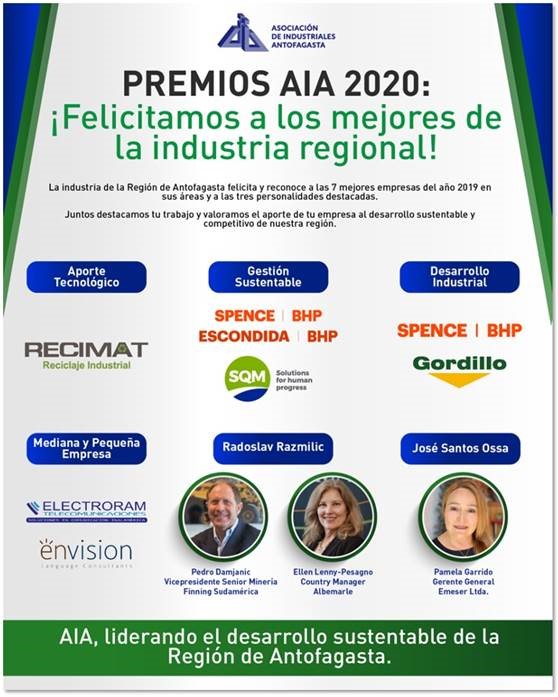 La Asociación de Industriales de Antofagasta, AIA, que cuenta con una trayectoria de 76 años, anualmente reconoce en distintas categorías a las personas y empresas más destacadas de la industria regional. En esta versión y por primera vez, el Premio Radoslav Razmilic se otorgó a dos líderes de la industria como fue el caso de Pedro Damjanic, de Finning; y el de Ellen Lenny-Pesagno, la primera mujer country manager de Albemarle.